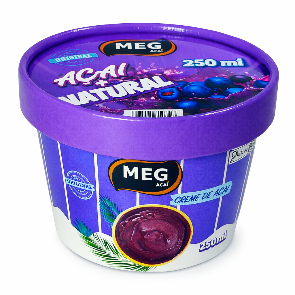 O Creme de Açaí MEG – Sabor Natural é a expressão pura do verdadeiro açaí. Produzido com polpa de açaí selecionada, cuidadosamente escolhida para garantir qualidade superior, o produto preserva o sabor autêntico da fruta, sua coloração intensa e suas características marcantes.
